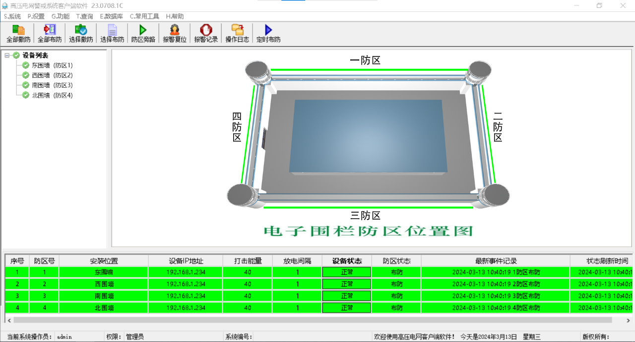 ● 功能:管理控制前端高壓電網主機、分控主機;實時監(jiān)控前端電網圍欄防區(qū)狀態(tài)以及對防區(qū)參數設定;支持報警信息、軟件操作信息查詢導出